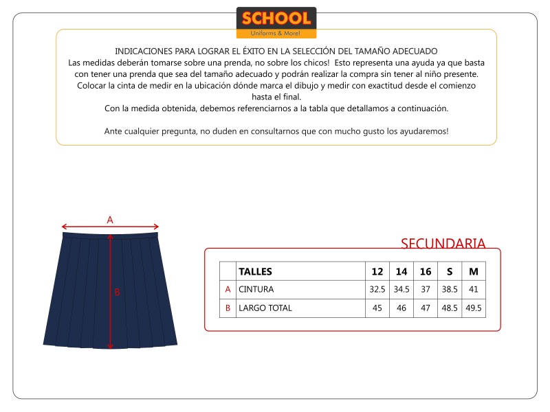 La falda está confeccionada en gabardina y posee las tablas marcadas de manera de facilitar su mantenimiento y planchado.  La tela utilizada es resistente al uso diario y a los lavados.